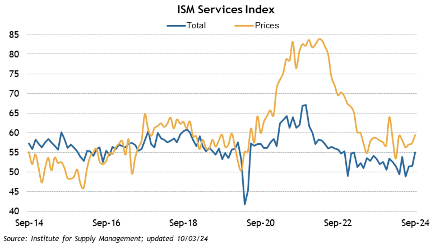 The economic calendar was packed, with all eyes focused on Friday’s Employment Situation report. Non-farm payrolls increased by 254k, well above the estimated 150k. The August and July figures were also revised higher, pushing the 3-month average to 186k from 140k. Private Payrolls grew by 223k, again well above the consensus estimate of 125k. The Unemployment rate fell to 4.1%, down from 4.2%, and the decrease occurred despite increased available labor. Average Hourly earnings increased by 0.4% versus the estimated 0.3%. On a year-over-year basis, wages grew by 4%, up from 3.9% in August. The Average workweek came in at 34.2 hours versus the estimated 34.3 hours. Overall, it was a very impressive report, sending investors back to the drawing board to recalibrate US monetary policy. Initial Jobless Claims increased by 6k to 225k, while Continuing Claims fell by 1k to 1826k. ISM Manufacturing continued to be in contraction mode with a reading of 47.2. However, ISM Non-Manufacturing expanded at the fastest pace since February of 2023 at 54.9, well above the expected 51.7.